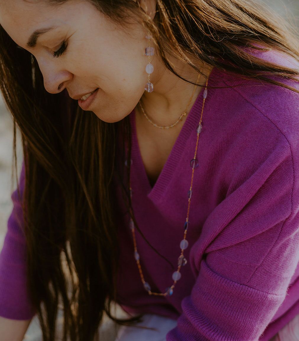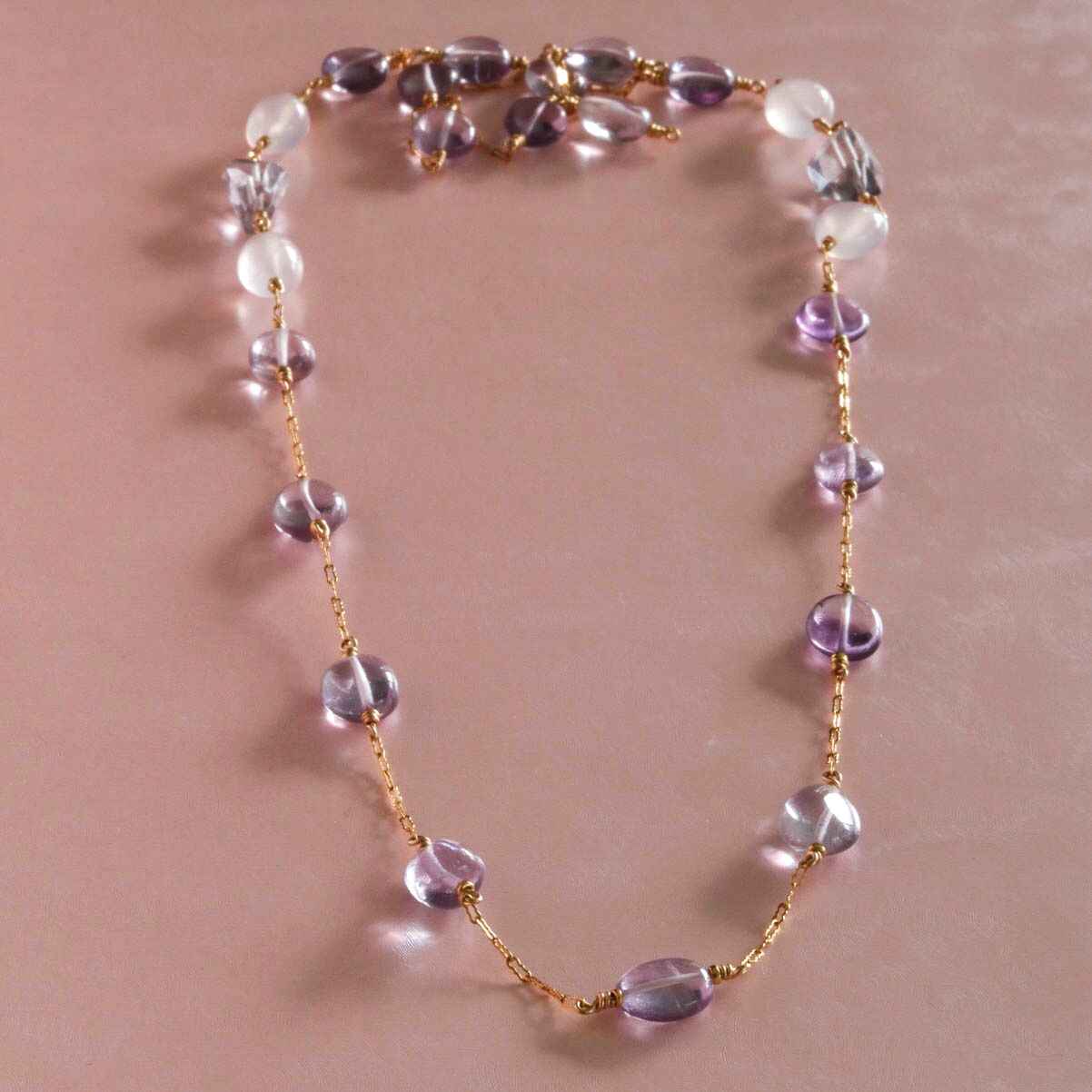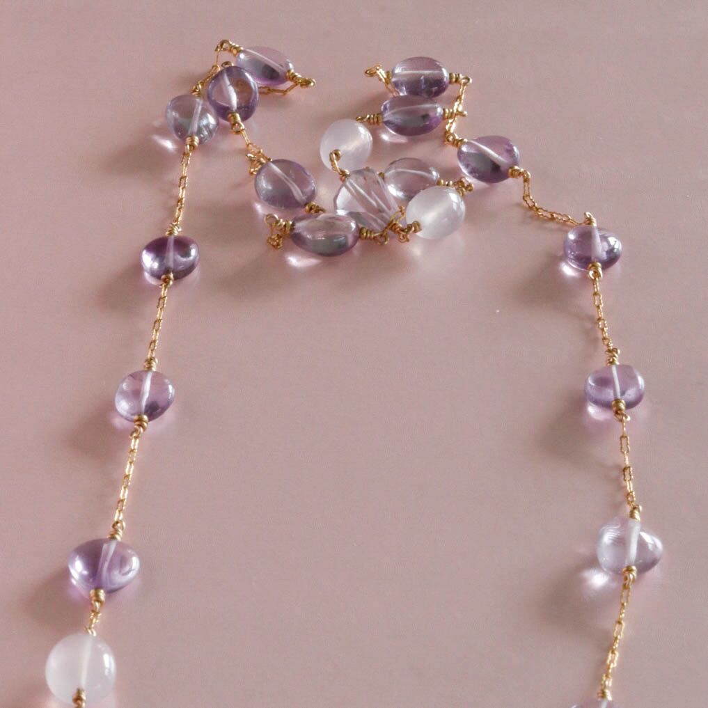 A long artisan long necklace, handcrafted with delicate gemstones in shades of lavender and blush, radiating natural beauty and elegance.